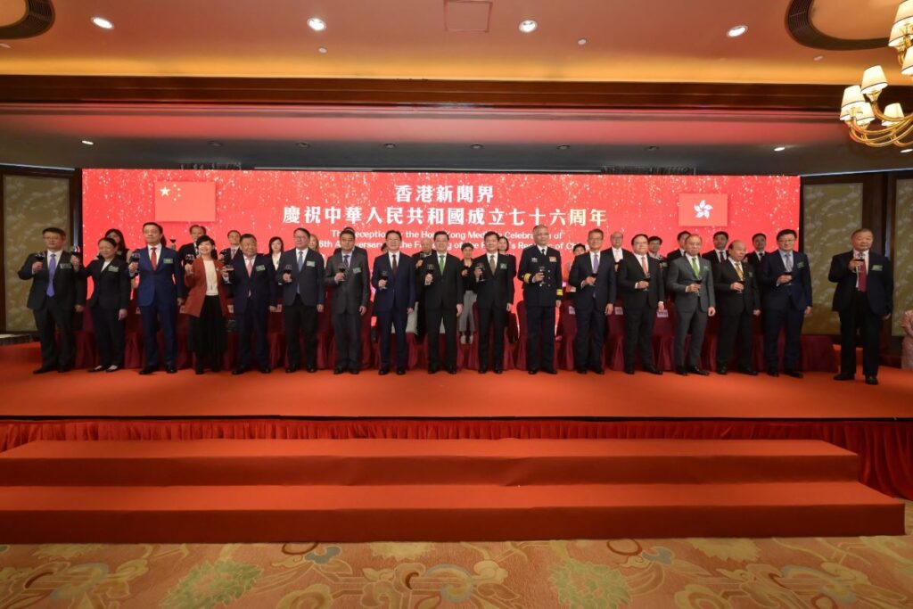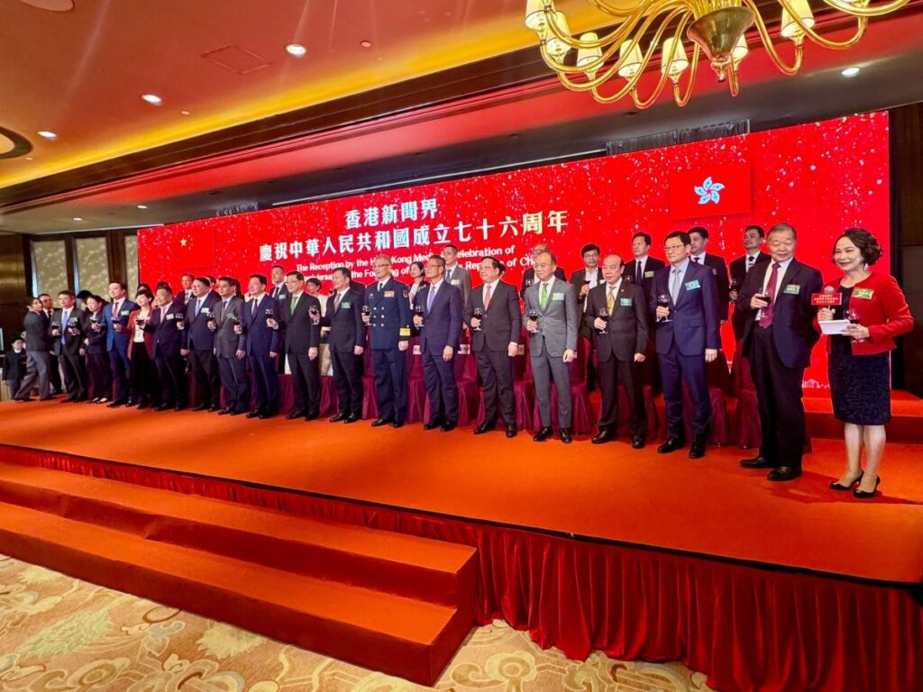 「香港新聞界慶祝中華人民共和國成立76周年」活動,今日(9日)下午假香港港麗酒店宴會廳舉行,獲邀出席嘉賓包括香港特別行政區行政長官李家超、中央人民政府駐香港特別行政區聯絡辦公室主任周霽、中央人民政府駐香港特別行政區維護國家安全公署副署長陳楓、中華人民共和國外交部駐香港特別行政區特派員公署副特派員花有、中國人民解放軍駐香港部隊副司令員譚志偉以及香港特別行政區政務司司長陳國基、香港特別行政區財政司司長陳茂波、紫荊文化集團董事長許正中,以及全國政協委員、香港新聞界國慶籌委會主任委員、香港新聞工作者聯會主席、香港大公文匯傳媒集團董事長李大宏等,還邀請多達500位新聞界舉足輕重的知名人士及社會賢達,全場星光熠熠。