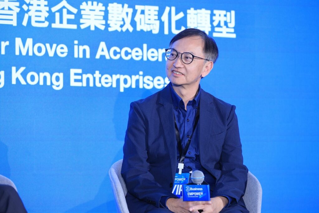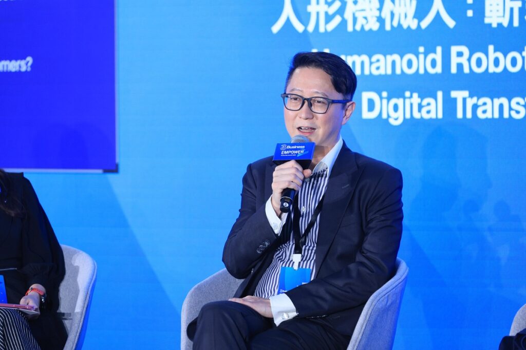人形機械人有助香港企業數碼轉型,林智祥以自己公司為例,分享公司正為不同企業提供機械人服務,並介紹了實際部署經驗和挑戰。鍾偉強以行動支持本港機械人的未來應用,他去年創立AI公司,建立AI超級計算生態系統,為機械人提供了強大的運算支援。