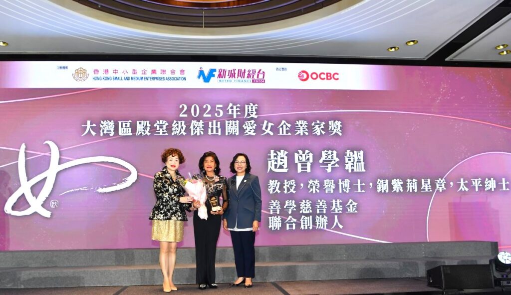 「2025年度大灣區殿堂級傑出關愛女企業家獎」頒發予善學慈善基金聯合創辦人趙曾學韞教授(榮譽博士、銅紫荊星章、太平紳士),以表彰其多年來在教育、慈善及社會服務領域卓越貢獻。