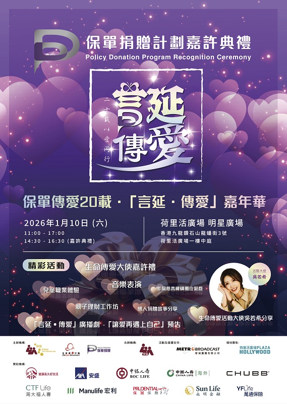 保險不僅是個人保障,更可成為延續愛心的慈善工具。保協慈善基金轄下「生命傳愛行動」推動的「保單捐贈計劃」成立20周年,截至2025年3月31日,認捐保額近5.8億港元,展現大愛。「生命傳愛行動」將於1月10日舉辦「保單傳愛20載・『言延・傳愛』嘉年華」,與眾同樂。人氣歌手吳若希(Jinny)擔任活動大使,分享理財心得。