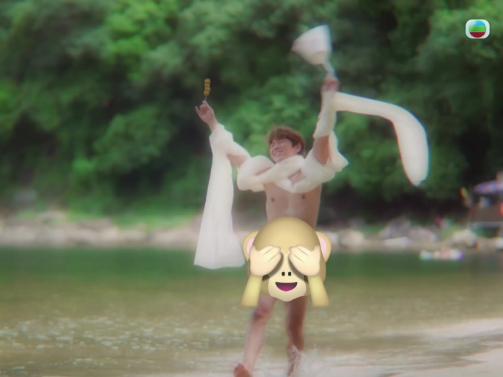 另外昨天(14日)播出的一集中羅天宇有突破性演出,他在沙灘披滿成身廁紙、手執外賣袋加魚蛋,開心地瘋狂轉圈兼傻笑。這一幕羅天宇認拍得非常尷尬,因為要脫衣服展示他的身形,不過在電視播出的畫面中,重要位置竟然有一隻馬騮Emoji遮掩著,令黎諾懿觀看完大呼不開心:「因為唔知點解打住隻馬騮仔,因為天宇身形係唔需要打馬騮仔,所以我哋依家極力爭取點將冇馬騮仔版本原裝畀大家睇。」