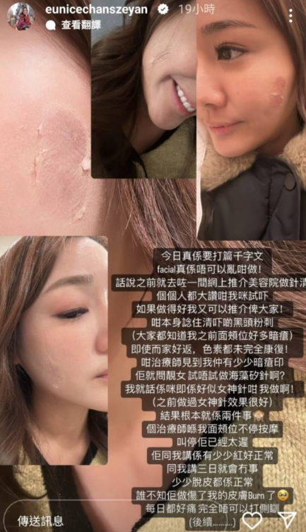 其後,陳詩欣質問美容店時,卻得到了「做傷了」的簡單回覆,美容店回覆令她十分憤怒,陳詩欣在IG發布限時動態公審美容店並寫道:「我真係嬲到爆炸,因為冇諗過會咁樣,亦都冇諗過得到這樣的回覆。佢只係回覆我一句做傷了,一句對唔住都冇,只告訴我佢有好多客都係咁,一定會好起來的。」